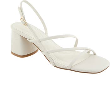Tubular, asymmetric straps and an angular square toe add dimension to a slingback sandal grounded by a cushioned footbed and low block heel.
