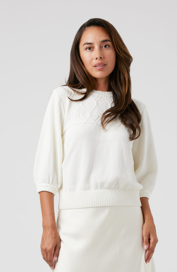 The Rory Sweater is a casual, relaxed fit knit sweater featuring a crew neck and 3/4 sleeves. It is designed with a subtle cable knit detail on the yoke, ribbed hem, and cuffs, making it a perfect addition to your wardrobe.