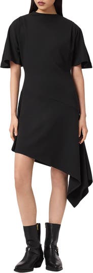 An asymmetric skirt dials up the modern appeal of this sophisticated short-sleeve minidress.