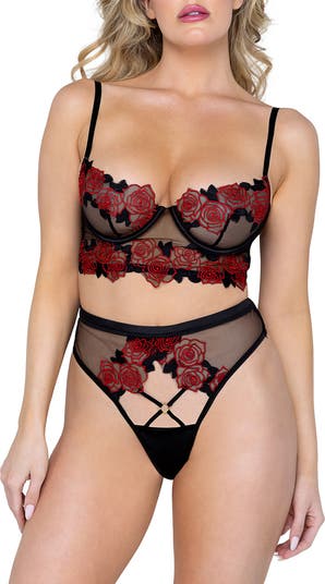 Sheer mesh lends alluring vibes to this two-piece underwire bra and high-waist thong set complete with stunning embroidery that was meant to be seen.