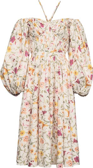 The Rosa Dress is crafted from signature luxurious cotton sateen awash in botanicals. Set against an ecru cream base, this bestselling silhouette features, ,off-shoulder puff sleeves, ruched bodice and a halter style neck that create a chic and modern feel. The full midi skirt adds femininity and movement, making this midi dress a perfect choice for any occasion.