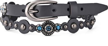 A vibrant leather belt featuring decorative metal accents and a vintage inspired buckle. Designed to add personality and polish to any look.