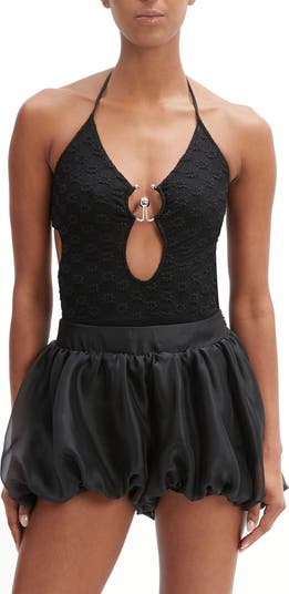 This lace bodysuit is serving sultry vibes with its peekaboo cutouts, bold keyhole front and adjustable ties for a perfect fit.