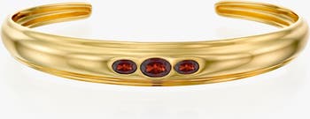 A stunning bangle bracelet featuring three natural embedded red garnet stones, creating a beautiful gradation effect. The central stone, slightly larger, is flanked by two smaller ones, enhancing the bracelet’s elegant flow. Tapered at both ends, the bangle gradually widens toward the center, where the stones are set, offering a refined and graceful design