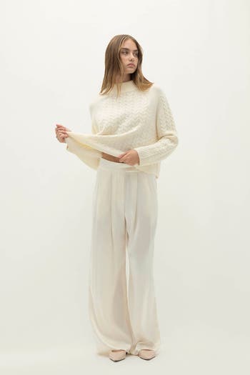 Rosalie silk trouser is a luxurious staple with a wide leg, elegant pleats, and an elastic-back waist for comfort—perfect for effortlessly elevating any look.