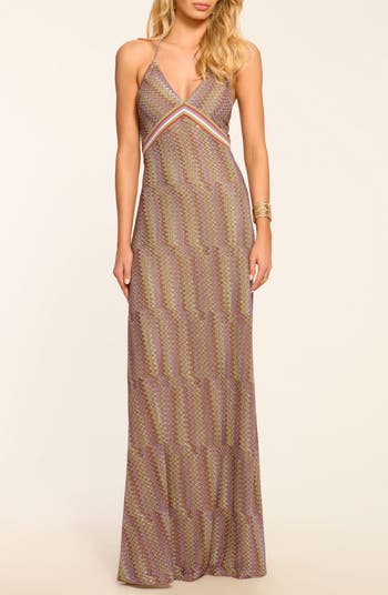 Shimmering metallic threads and chevron stitching add texture and shine to this figure-skimming maxi meant to show off your shoulders and back.
