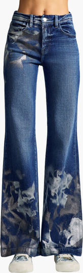 Our Rosaline Premier High Rise Holly Flare Jeans are made domestically in small batches by a local wash factory in Los Angeles. Each pair of this denim is single-handily, finely washed in a beautiful dark wash color. Sits above the waist and relaxes throughout the leg for a straight leg fit. Features a beautiful silver foil detail that makes the jeans shine like a mirror ball, 5-pocket style, one button closure, and zip fly. Feel good about what you wear in these premiere jeans.