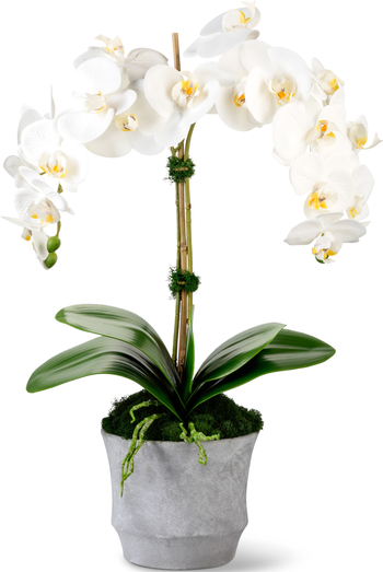 Enhance any space with the Rosalyn RealTouch Orchid Arrangement. Showcasing double exquisite RealTouch Orchids, accompanied by beautiful Orchid leaves and rattan sticks, this elegant design is set in a gracefully curved architectural cement vase. A harmonious blend of beauty and sophistication, it elevates the ambiance of any room with its refined presence. A lasting luxury, timeless and unrivaled.