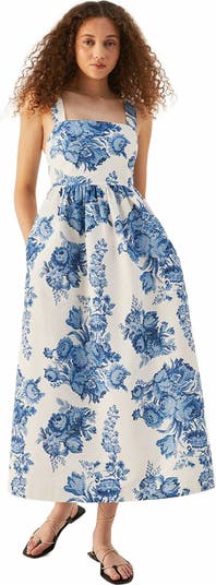 This cotton ottoman dress has an elasticated back for a custom fit and is patterned with a classically French toile de Jouy.
