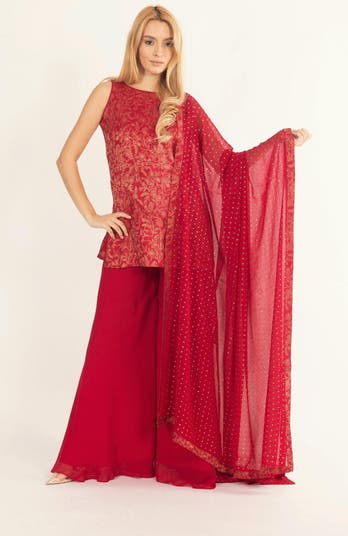 The Rosavelle Red Jacquard Salwar Kameez Set is a statement of elegance and tradition. The kameez is crafted from jacquard silk in a rich red hue and features beautiful all-over golden patterns. The flowy georgette salwar adds a graceful touch with every movement. The matching red georgette dupatta is adorned with all-over mukaish work. The Rosavelle Red Salwar Kameez Set seamlessly blends tradition with sophistication, making it a perfect choice for any special occasion.