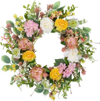 This artificial spring wreath adds pops of color with its various flowers. With a combination of yellow roses with orange trim, pink Hydrangeas and white Peonies, it will be a blossoming addition to your doors and mantles. It is bursting with green leaves, berries, and flower buds making it full and luscious. It can be displayed by hanging on it's natural grapevine base or laying on a flat surface as a centerpiece. A great way to add a touch of spring and summertime nature to your home or office. Features: Mixed floral and foliage Spring wreath A variety of flowers such as hydrangeas, roses, and peonies Also designed with small flowers, baby breaths and berries Designed with numerous green leaves Natural twig grapevine backing for hanging Recommended for indoor use only - if using outdoors place under a covered area No assembly required - wreath comes in 1 piece Dimensions: 26" diameter (measured from outermost edge to outermost edge across the wreath) Inner wreath: 11" diameter Material(s): polyester/twig/wire/plastic Note:Branches are compressed for shipment, and need to be fluffed out upon arrival to look like the photo.