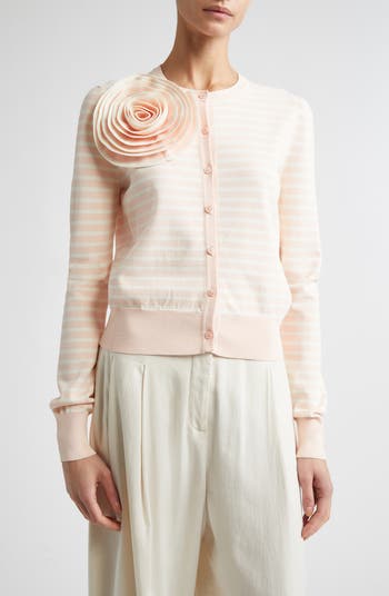 Lela Rose finds harmony in duality for spring '26, balancing softness and structure in this classically striped cardigan, where an exquisite rose appliqué blossoms like a miniature sculpture.