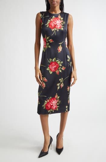 This satin sheath dress patterned with D&G's seasonal rose print is splashed with lavish blossoms, representing everyday elegance with a touch of floral romance.