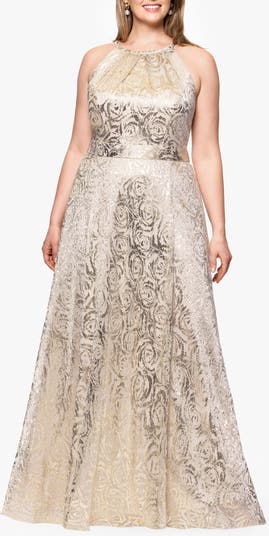 Swirling metallic blooms elevate this glamorous gown designed with sleek cutaway shoulders and a perfectly draped skirt.