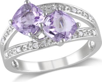 Adorn your hand with the soft, romantic color and sparkling brilliance of this Rose de France and diamond two-stone ring. Crafted in luminous sterling silver, the ring features two magnificent cushion-cut Rose de France amethyst stones nestled side-by-side, showcasing a delicate lilac-pink hue. These beautiful gems are highlighted by subtle diamond accents and set upon a gracefully split shank, which adds a modern touch and enhances the overall visual impact. This piece is a sophisticated and charming accessory, perfect for expressing a unique, feminine elegance.