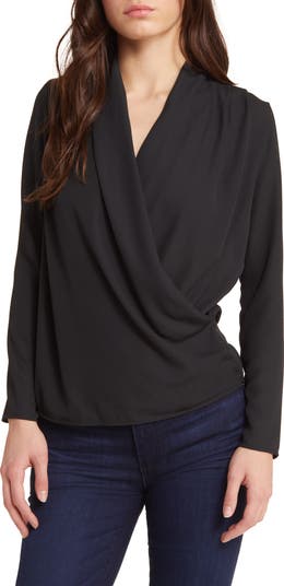 A draped surplice V-neckline lends elegance to this long-sleeve blouse that travels seamlessly from workweek to weekend.