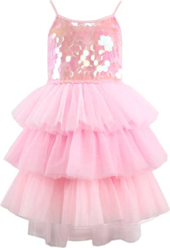 Stunning pink dress adorned with shimmering paillettes that create a magical and eye-catching look. Features a beautiful tiered tulle skirt for an added touch of elegance and charm.