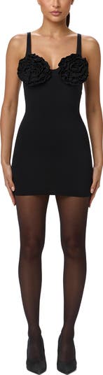 Strategically placed roses add to the flirty style of this stretchy minidress that will move with you on the dance floor and is soft to-the-touch.