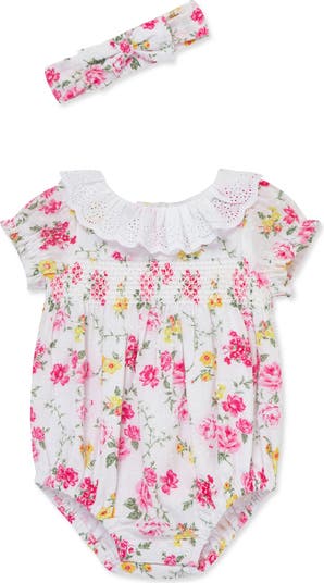 An embroidered eyelet collar sweetens a rose-print cotton bubble romper that's paired with a matching bow-tied headband for complete cuteness under sunny skies.