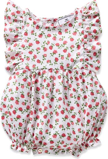 Pretty pink roses are scattered across a ruffled romper made from breathable cotton-blend twill to be as comfortable as it is adorable.