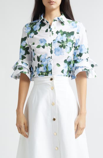 Tiered-ruffle cuffs further the blooming effect begun by the rose print arranged in bouquets and as single flowers across this beautifully tailored shirt.