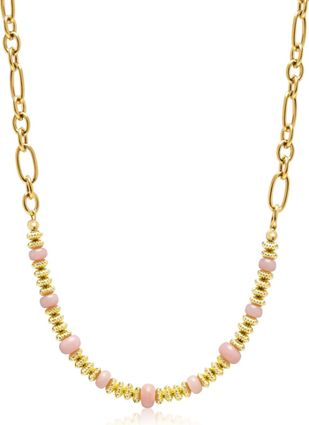 A bold mix of textures and tones, this choker combines sleek gold links with soft rose quartz beads framed by textured gold spacers, blending gentle femininity with a polished edge. Featuring two distinct chain styles, it's a statement piece made to layer or stand alone.