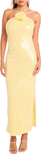 A dimensional rose blooms from this luminous sequin maxi dress framed by a halter-tie neck and side slit for a stunning night-out look.