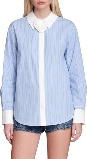 A rose appliqué romances this crisp cotton shirt made with a back box pleat for a roomy fit and finished with a tuckable shirttail hem.