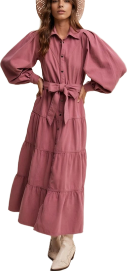 Rose Tiered Belted Button Down Maxi Shirt Dress