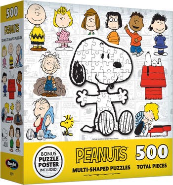 ROSEART: MINI SHAPED: PEANUTS - 500 PIECE PUZZLE - RoseArt Multi-Shaped Puzzles featuring the beloved Peanuts characters, a delightful collection of 12 uniquely shaped puzzles capturing the essence of Charlie Brown, Snoopy, Linus, Lucy, and more. Crafted with precision and quality, these puzzles promise hours of entertainment for puzzle enthusiasts of all ages. Ideal for gifting on birthdays and holidays, these Peanuts-themed puzzles offer a nostalgic bonding experience for friends and family. Whether enjoyed during cottage getaways, summer vacations, or cozy winter nights by the fire, assembling these puzzles fosters relaxation and camaraderie. Each puzzle piece is conveniently color-coded on the back, facilitating easy sorting and assembly. The product image showcases a vibrant array of the Peanuts character puzzles, featuring iconic scenes and expressions adored by fans worldwide. With their diverse shapes and charming designs, these puzzles serve as both entertainment and decorative art pieces once completed. Treat yourself or your loved ones to the joy of puzzling with RoseArt Multi-Shaped Puzzles featuring Peanuts and create beautiful memories with every piece assembled.