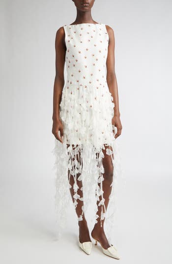 Embroidered rosebuds add charming detail, while swishy floral fringe brings dramatic movement to this sleeveless dress that was featured on the label's spring '25 runway.