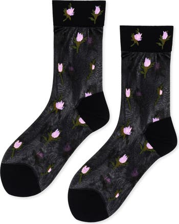 Hansel From Basel Rosebud Sheer Crew Socks, Alternate, color, Black