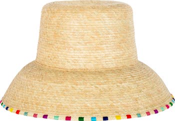 Enjoy the shade-providing and style-enhancing look of this handmade straw bucket hat charmed by rainbow-hued trim for an added kick of color.