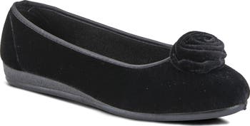 A soft rose tops a velvety ballerina slipper that cushions your feet with high-density memory foam and a shock-absorbing, antislip sole.