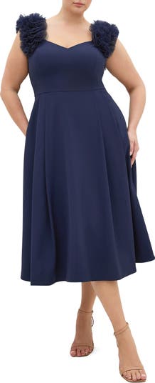 Grace meets glamour in this fit-and-flare stretch-crepe cocktail dress designed to flatter from every angle. A sweetheart neckline is framed by soft ruffled tulle cap sleeves, while princess seams shape the bodice for a tailored fit. Side pleats add movement and volume to the skirt, creating an elegant silhouette.