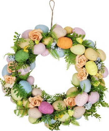Add a touch of beauty and elegance to your Easter decor with this Spring Easter wreath. The wreath features delicate pastel-colored eggs nestled among vibrant spring flowers, creating a stunning display that is perfect for welcoming the season. This wreath fits perfectly on any door or wall, adding a festive and cheerful touch to your home. Product Features: Unlit Decorated with smooth and textured Easter eggs Accented with flowers in soft pastel colors and mixed greenery No assembly required – wreath comes in 1 piece Comes ready to hang with a jute rope loop Recommended for indoor use - if using outdoors place under a covered area Dimensions: 15” diameter (measured from outermost tip/edge to outermost tip/edge across the wreath) Material(s): PVC/foam/plastic