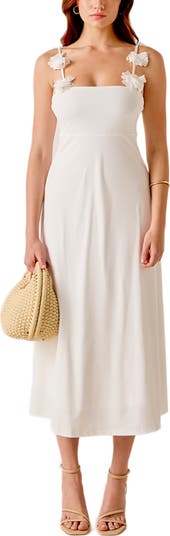 Dimensional rosettes dot the straps of this effortlessly elegant A-line dress that's sure to be a summery favorite.