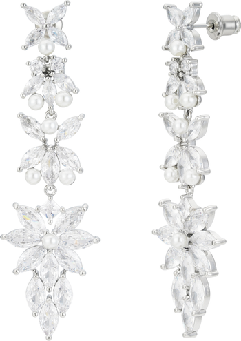 These elegant drop earrings feature a cascading floral design with shimmering crystals and delicate pearls, perfect for making a statement on your special day.