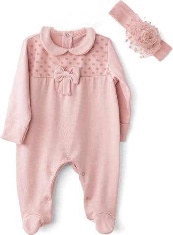 A delicate blend of texture and charm, this blush-toned duo is made for first snuggles, sweet snapshots, and everything in between. Classic footed with textured bow and Peter Pan collar. Dotted mesh bodice adds subtle detail and vintage charm. Stretchy headband with layered floral embellishment for a picture-perfect finish.