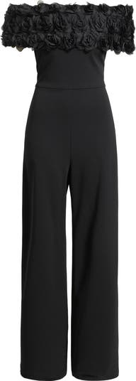 Frothy tulle rosettes romance this shoulder-showing jumpsuit punctuated with drapey wide legs.