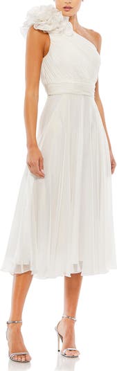 Elegant and chic, our Rosette One-Shoulder Tea-Length Dress features a statement rosette detail and a flattering silhouette, perfect for weddings and special occasions.