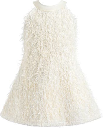 A celebration of texture and elegance, this sleeveless Tulleen dress features a rosette-covered silhouette with a graceful satin bow at the back. Designed for standout moments, it’s equal parts playful and polished. Allover floral texture with a flared A-line cut and high neckline for timeless charm. Back ribbon tie and flower-detailed shoes add a soft, romantic finish from every angle.