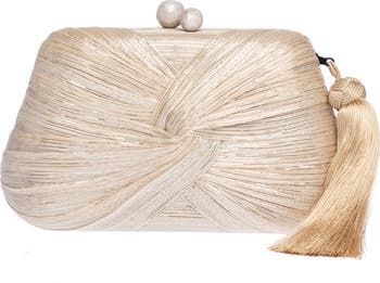 - Clutch in peach abaca / silver lurex with draped front and silk tassel