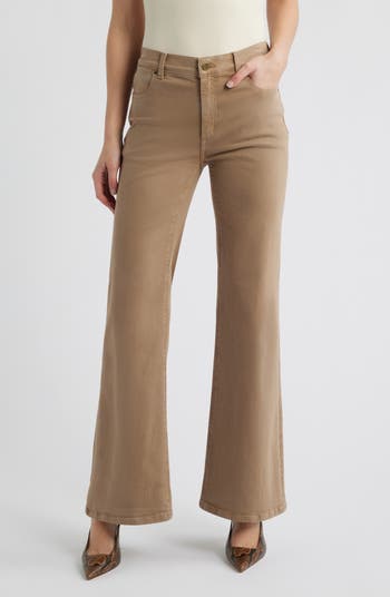 A leg-lengthening silhouette defines super-stretchy khaki pants offered with a high waist and widened legs.