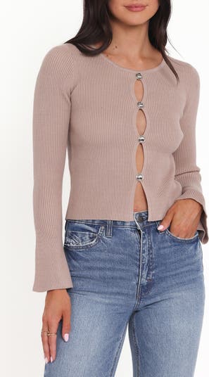Tacked front buttons highlight the keyhole cutouts on this long-sleeve sweater knit in a ribbed, fitted silhouette for instant allure.