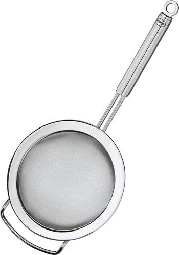 The Rosle 6.3-Inch Fine Mesh Kitchen Strainer is perfect for everyday kitchen tasks like straining sauces, rinsing grains, or sifting dry ingredients. Made from durable stainless steel with a finely woven mesh and a round handle for comfortable use.