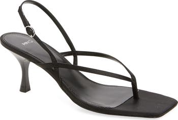 A strappy, minimalist design emphasizes the night-out glamour of this sandal lifted by a softly flared stiletto.