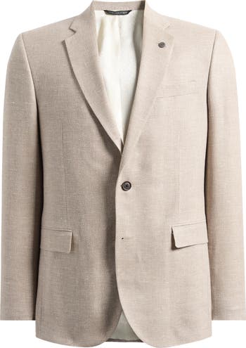A textured blend of wool and linen in a palette of tans and creams relaxes the formality of a sport coat designed with softly constructed shoulders and subtle tailoring in the waist providing a refined, comfortable silhouette. Detailed with traditional notched lapels and flap pockets, it makes a smart complement to any semiformal or warm-weather look.