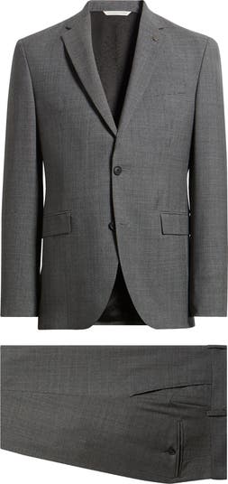 A subtly textured wool tick weave in shades of grey distinguishes a suit that's tailored in a slim fit and fitted in the waist for a smart, traditional profile. The flat-front trousers feature a lower rise and slightly tapered legs for a modern silhouette that looks crisp and clean in any setting.