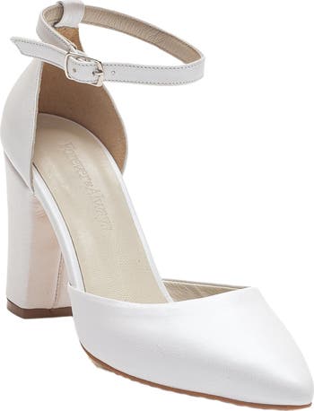 With a graceful closed-toe front and a delicate ankle strap, Rossella bridal block heels from Forever & Always Shoes effortlessly blend sophistication with a touch of romance. The 3.5-inch (approximately 9 cm) heel adds height and elegance, perfect for making a memorable entrance. Handmade in Turkey from luxurious Italian Nappa leather, these heels are designed to carry you confidently through every step of your special day. These shoes fit true to size, so we recommend ordering your regular size.